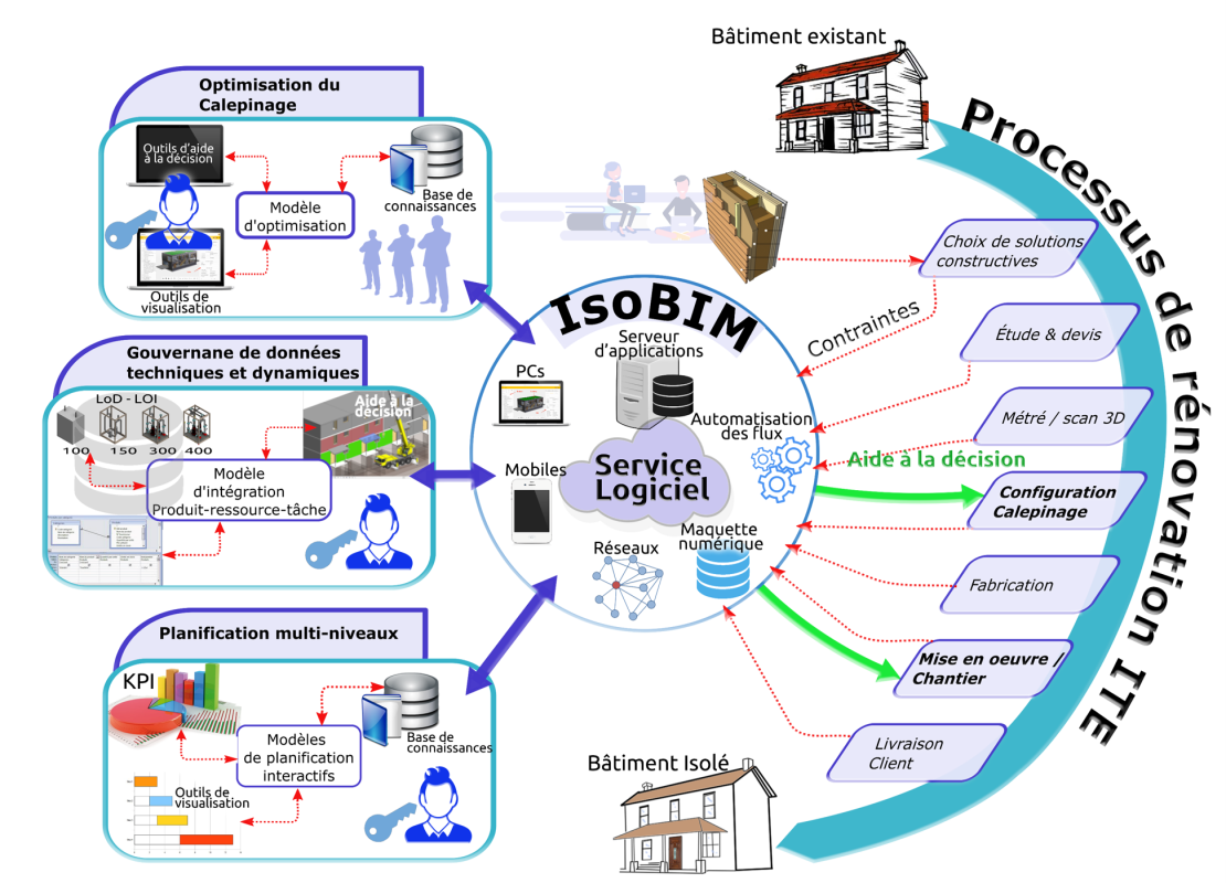 Le projet IsoBIM (Proposition d’un processus collaboratif pour la rénovation par isolation extérieure basé sur les paradigmes Lean et BIM), financé par l’Agence nationale de la recherche, est coordonné par le Centre de Recherche en Automatique de Nancy (CRAN) sur la période 2020-2024. Ce projet collaboratif, qui rassemble plusieurs chercheurs du laboratoire, d’Armines Albi CGI et de l’ISAE-SUPAERO, est mené avec le CRITT Bois et les entreprises Poirot Construction et Synaptic. L’ambition est de mettre au point un processus collaboratif pour la rénovation énergétique des bâtiments, et d’accompagner les TPE-PME de la construction bois dans leur transition digitale et l’amélioration de leur productivité (Voir les partenaires).